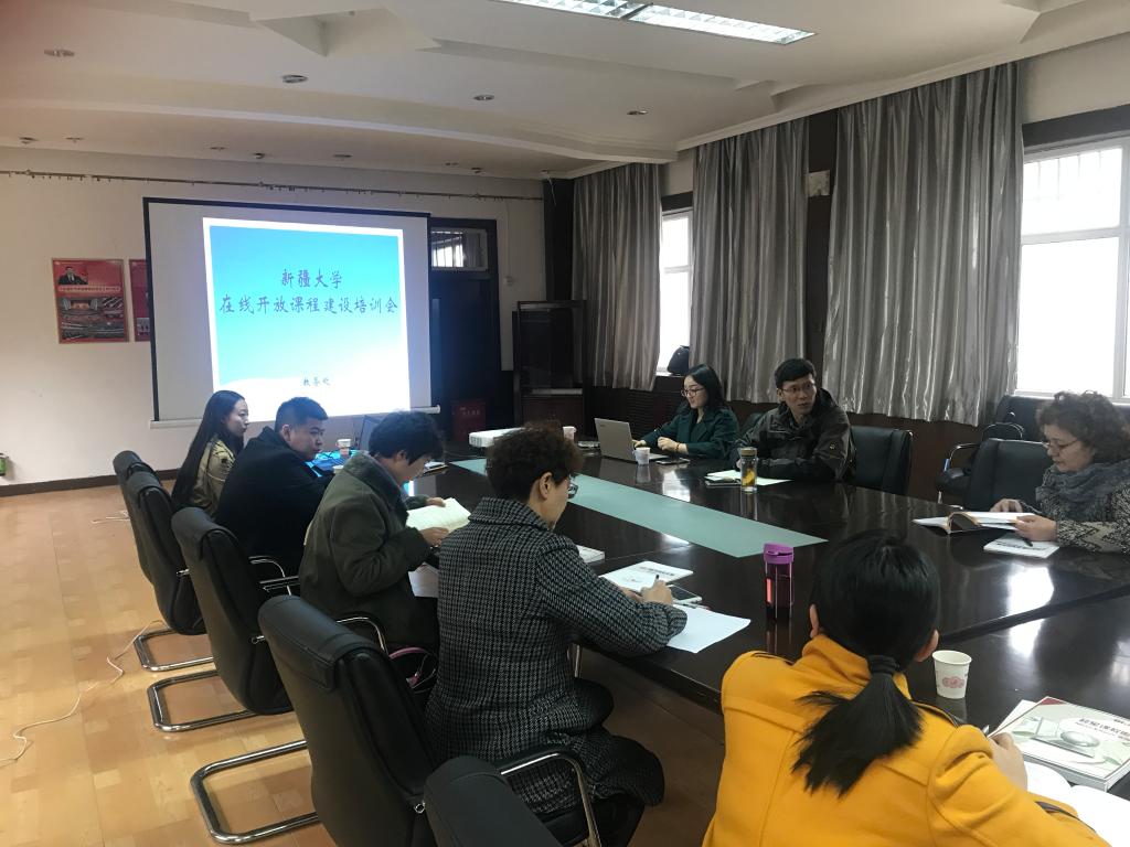 为了贯彻《国家教育事业发展“十三五”规划》,积极开展慕课建设和基于慕课的混合式教学改革,2018年3月16日下午,新疆大学举办了在线开放课程建设培训会。教务处副处长张宏立,《新疆历史与民族宗教政策教程》、《基础英语》、《高等数学Ⅲ》、《计算机文化基础》等课程组的教师,各学院致力于慕课建设和课程改革的教师,网络与信息技术中心相关老师以及北京超星集团新疆分公司团队人员30余人参加了会议,会议由张宏立副处长主持。